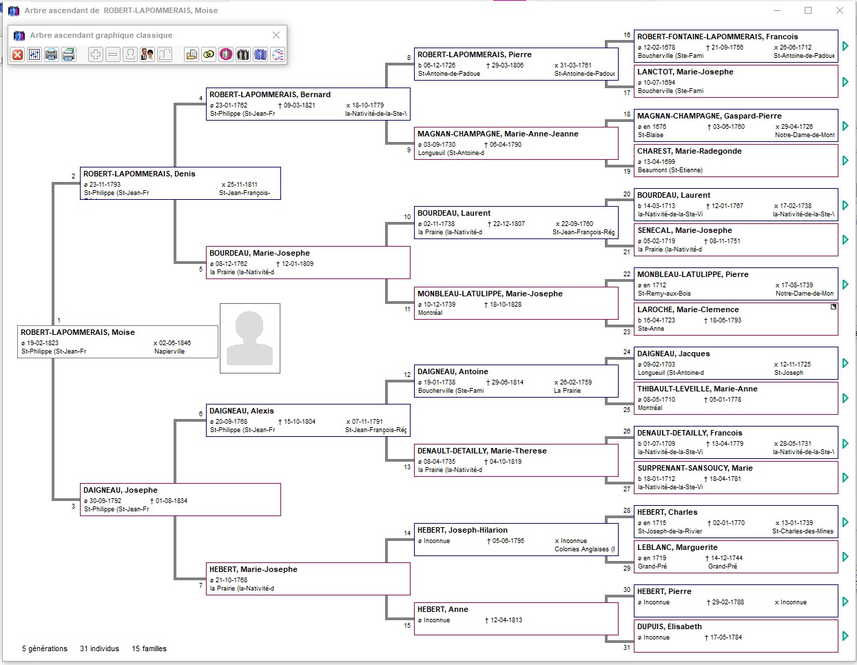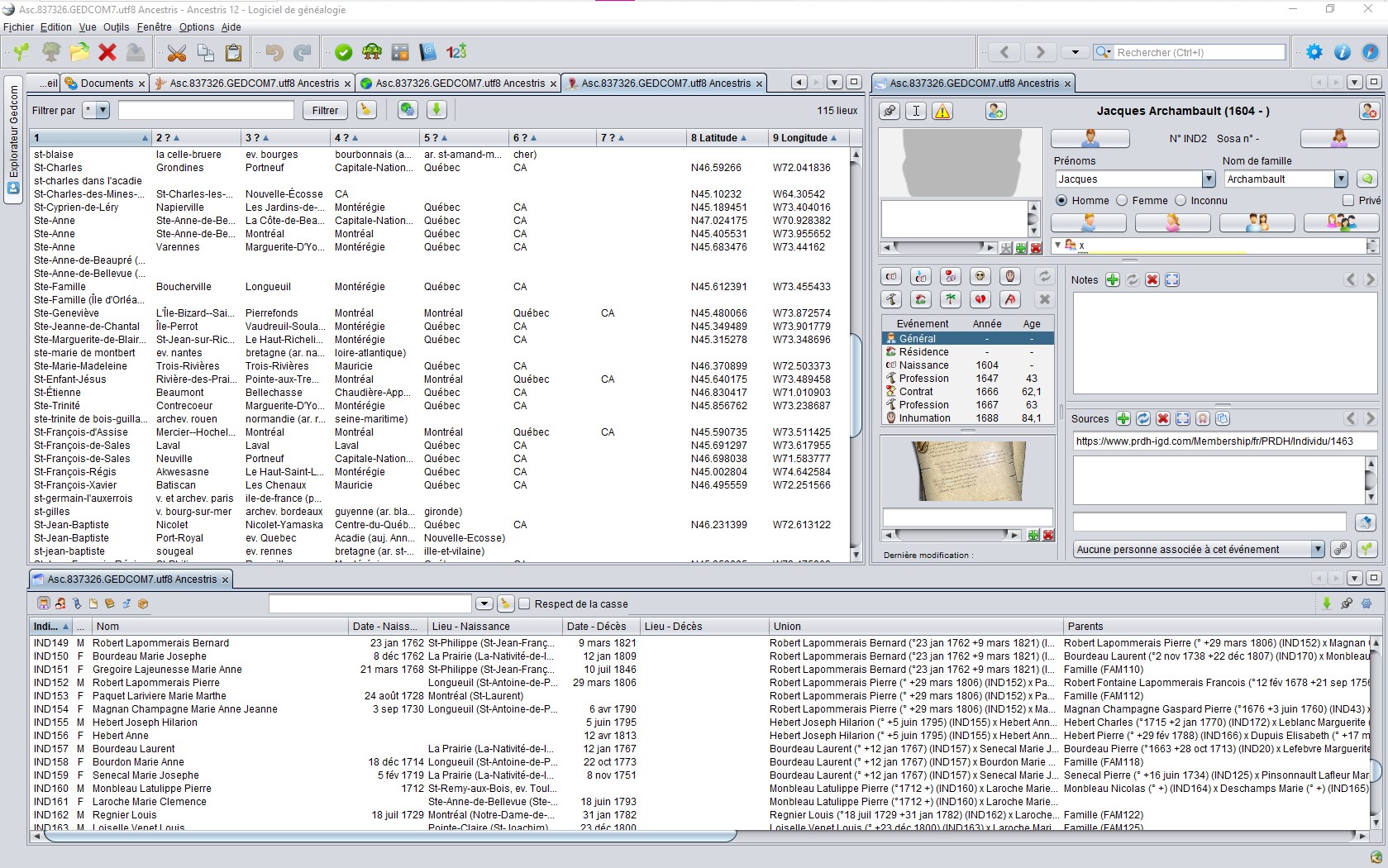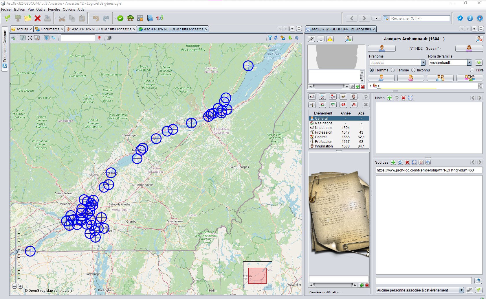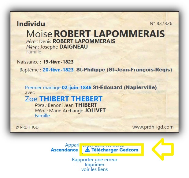Le PRDH-IGD propose de télécharger des ascendances complètes dans le format Gedcom à partir d'une fiche d'individu.