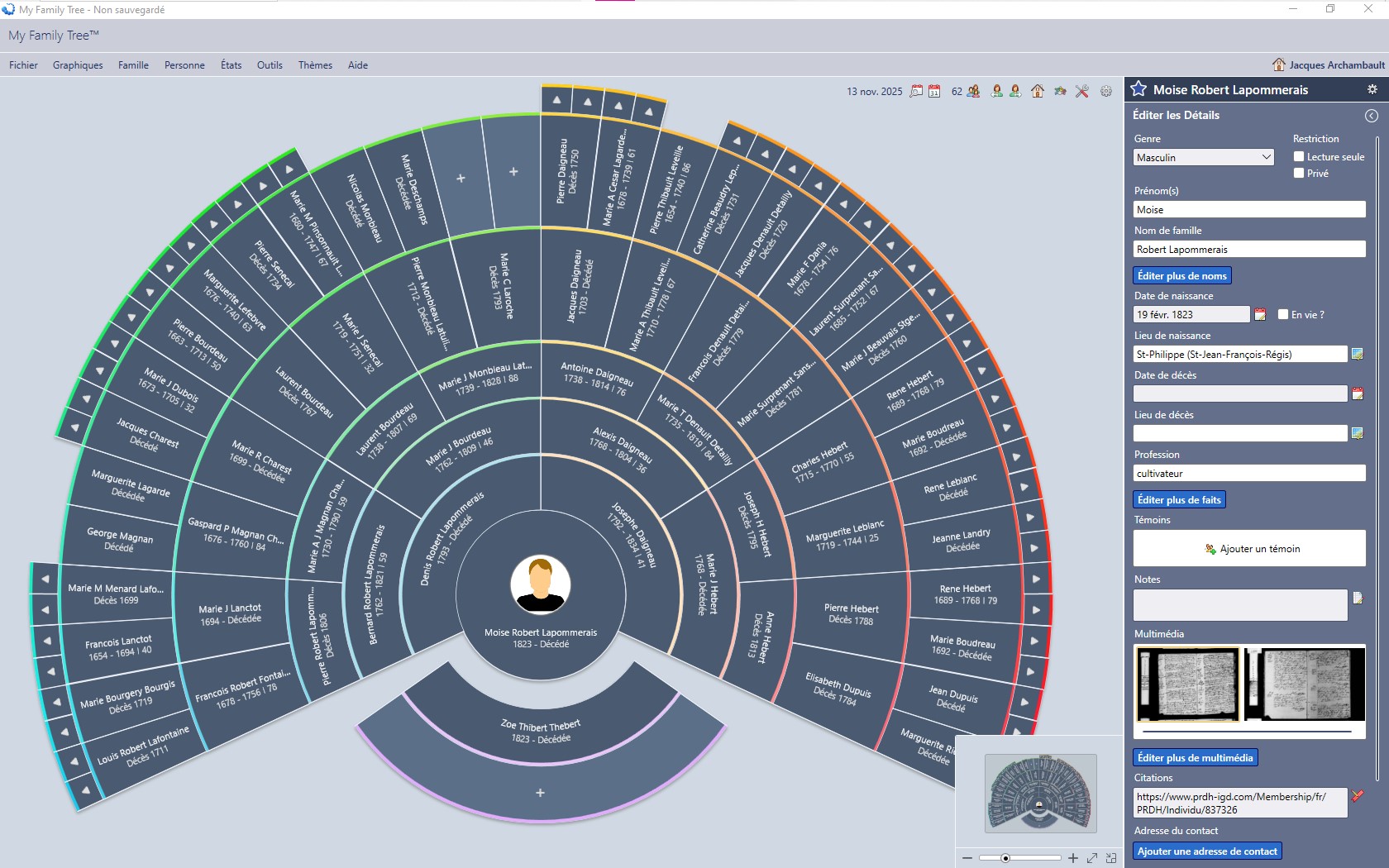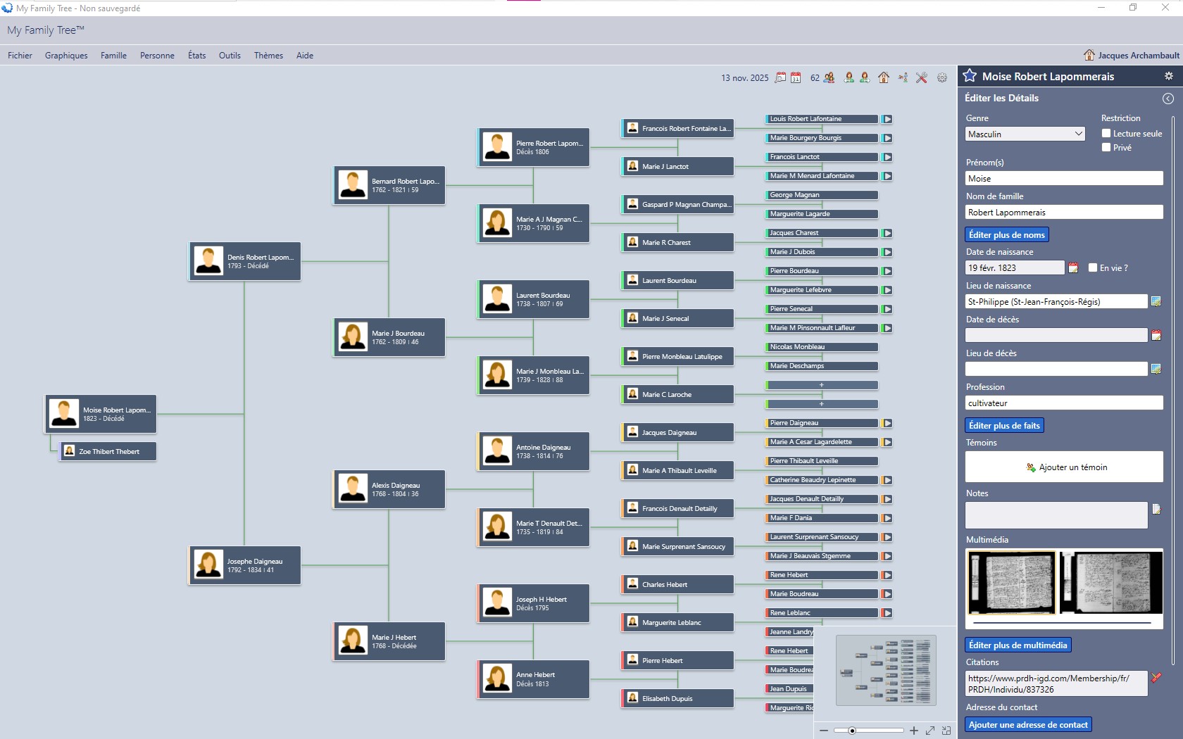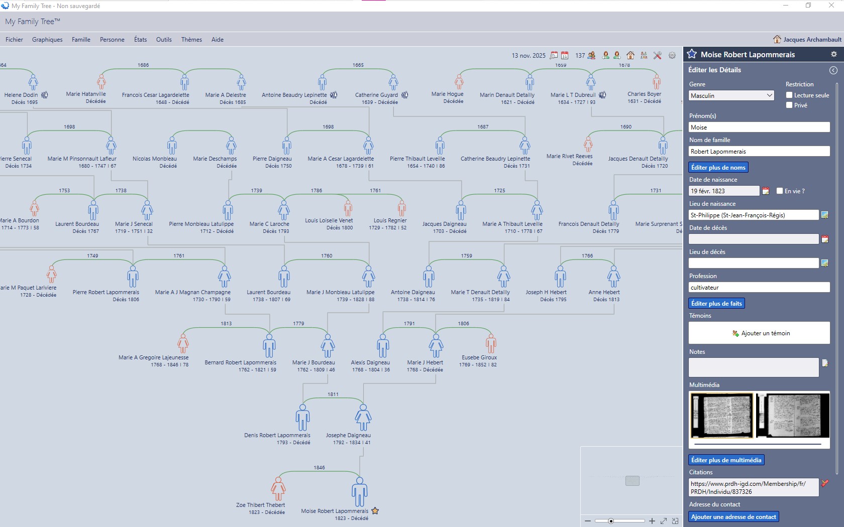 Le PRDH-IGD propose de télécharger des ascendances complètes dans le format Gedcom à partir d'une fiche d'individu.